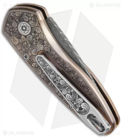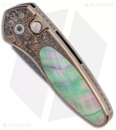 - Bronze Bruce Shaw engraved handle with black lip mother of pearl inlays.