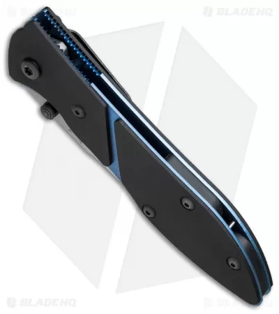 The Benchmade Sentinel features a blue anodized titanium frame handle with black metal inserts. It has a stainless steel blade in a spear point style with a satin finish. The blade can be quickly deployed with ambidextrous thumb studs. Includes a stainless steel pocket clip for tip-down carry.
