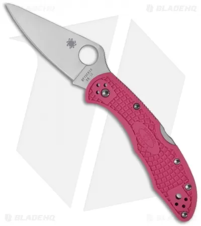 This Spyderco Delica 4 knife has a pink FRN handle and a full-flat ground VG-10 stainless steel blade that is satin finished with a plain cutting edge.