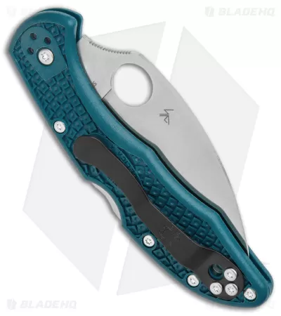 This Spyderco Delica 4 knife has a lightweight blue FRN handle and a Bohler K390 steel blade in a wharncliffe style with a plain cutting edge.
