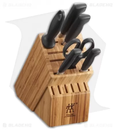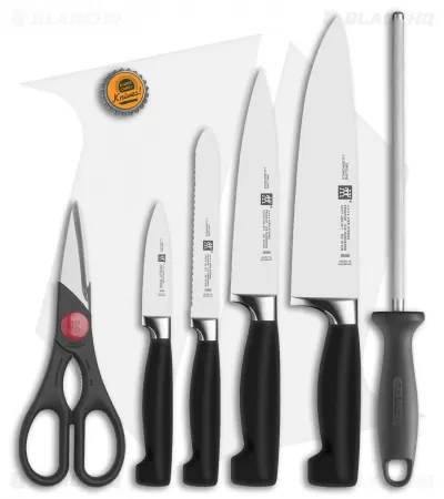 The Zwilling Four-Star line is characterized by smooth, ergonomic handles and proprietary Friodur blades. The line offers excellent kitchen knives that, with proper care, will last for generations. The seamless transition from bolster to handle looks clean and classy. These knives are tough and will promise a precise cut every time. Reserve your set today!